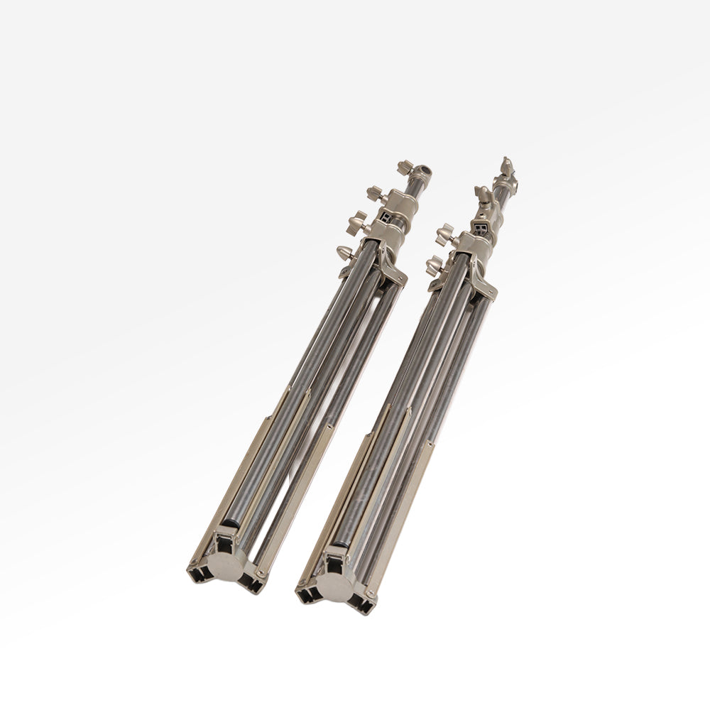 El Kit de 2 stands metálicos es un conjunto de soportes diseñados para sostener equipos de iluminación y accesorios audiovisuales de forma segura y estable. Su altura ajustable permite adaptarse a diferentes configuraciones tanto en estudio como en locación.